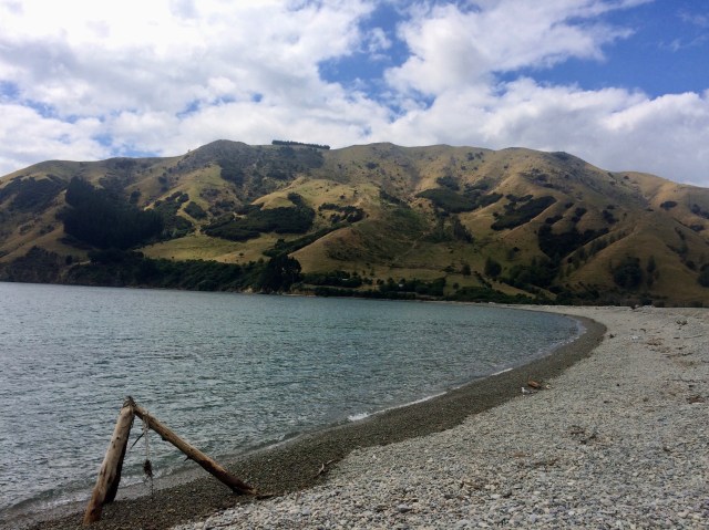 We drove out to Cable Bay which a a large bay between two huge steep mountains covered with green hills, sheep and a few cows.  The shoreline is all smooth rocks  (known as a shingle beach) that are comfortable to sit on without a chair. The water is blue and clear. Some people were snorkeling  and fishing, while others (like us) were sitting on the beach staring at the beauty around us.  I fed the birds and looked for heart shaped rocks most of the time.