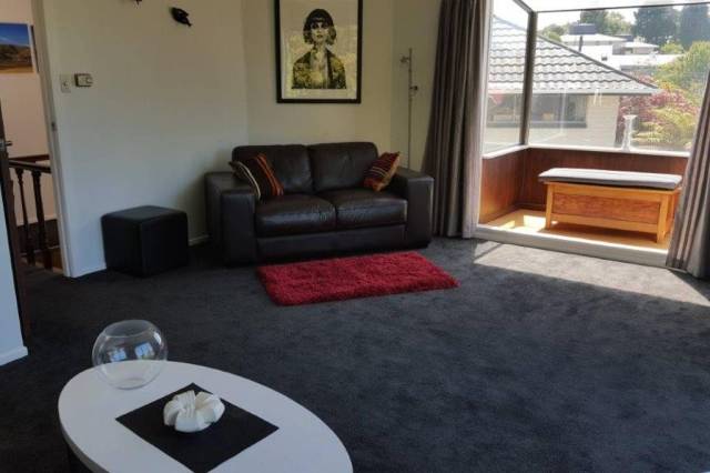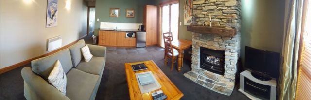 Wanaka Luxury Apartments – soft lounge chairs, cable TV, DVD player, fireplace, granite-topped kitchenette, spa bath and private patio and driveway. One bedroom apartment.