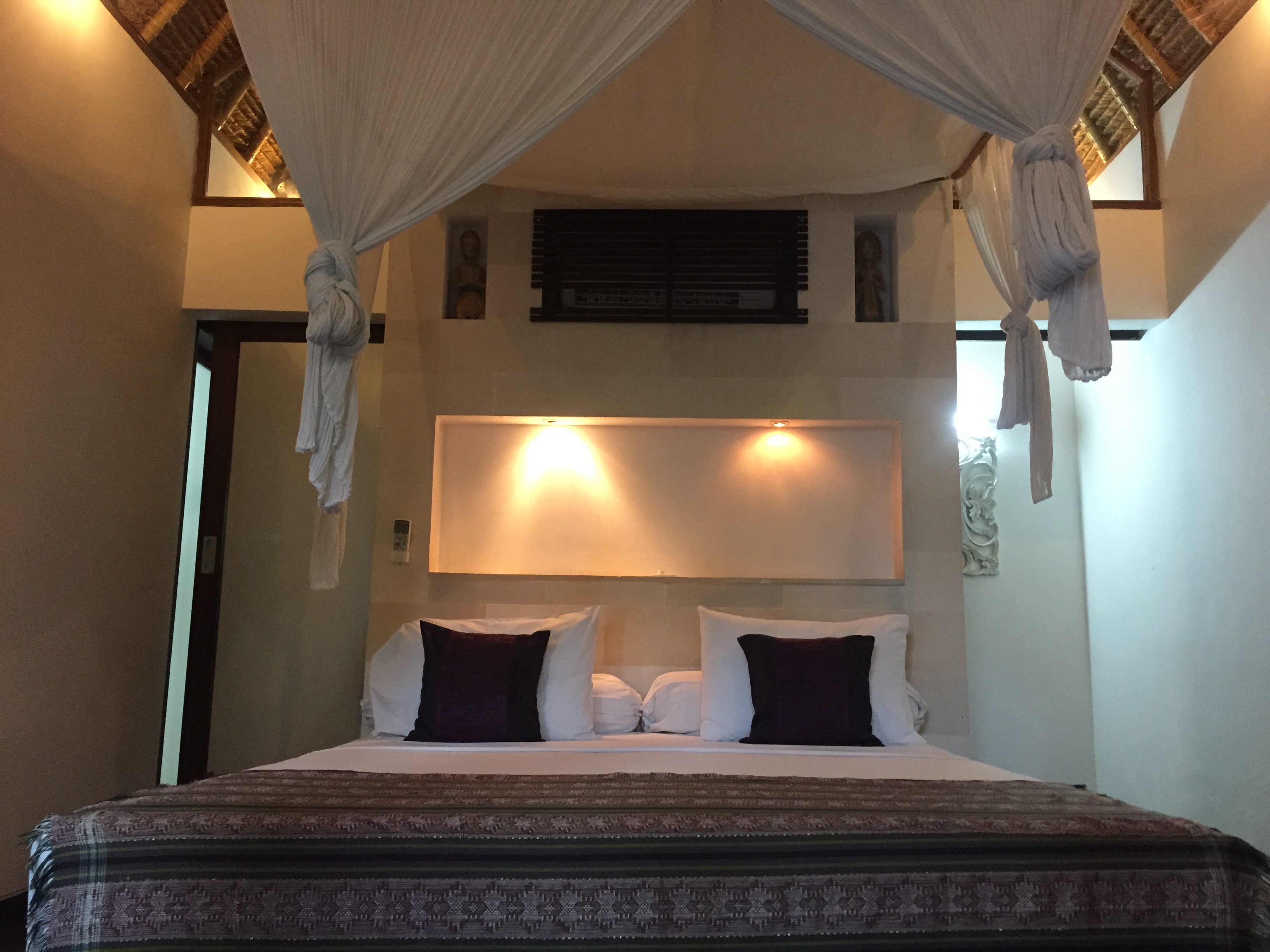 Tamu Resort: Very modern, beautiful and spacious room. The beach is directly across from the property with comfortable private beach lounge chairs and plush beach mattresses with large pillows. The beach towels are extra large and plush. The rooms surround a narrow pool. Beach sand is used around the property instead of cement. The room includes: refrigerator, in room safe, mosquito coils, racket and spray, spacious outdoor bathroom and shower, quality linens, tv, DVD player, air conditioner and ceiling fan.