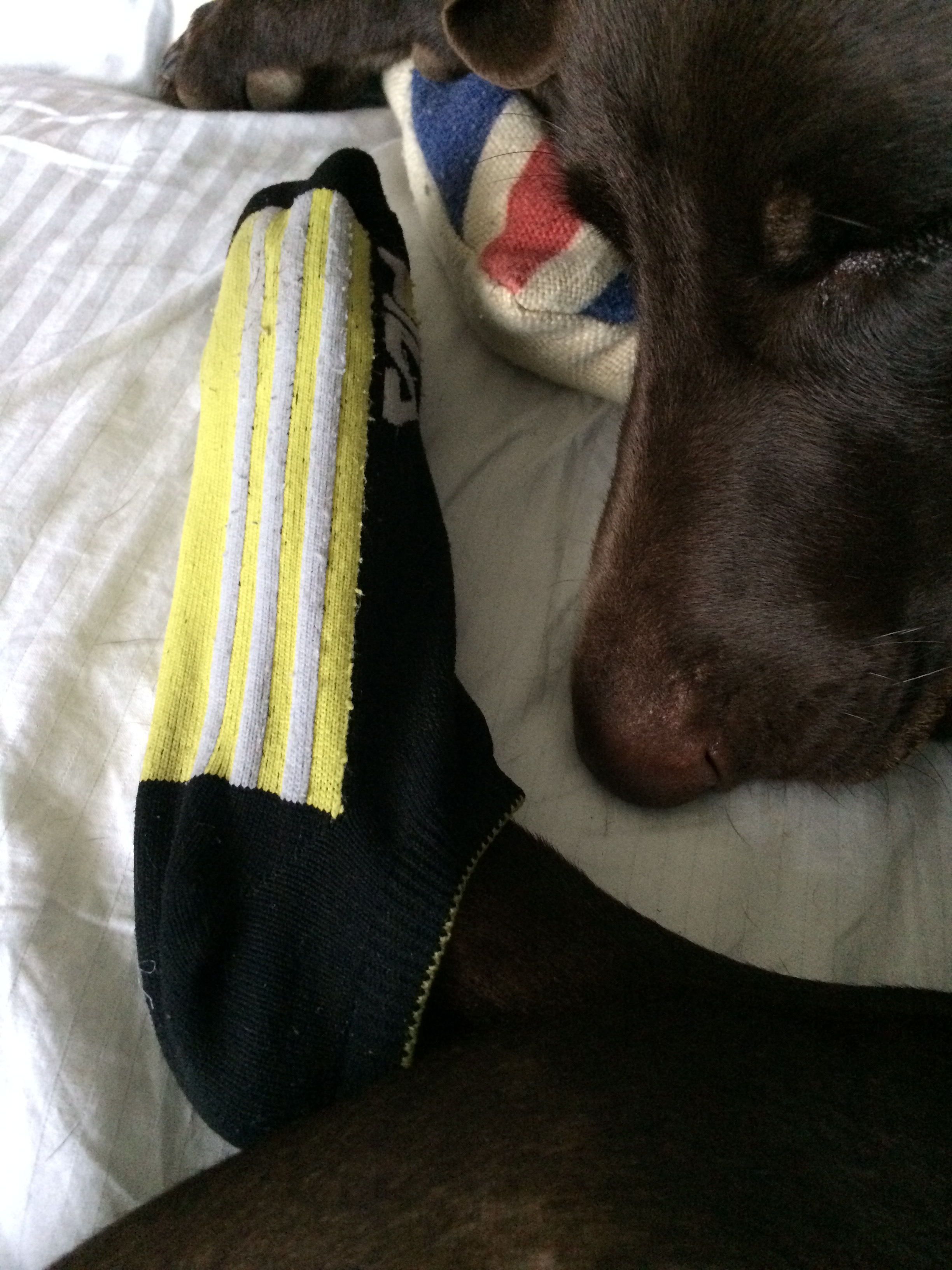 Hector with a sock on his injured paw